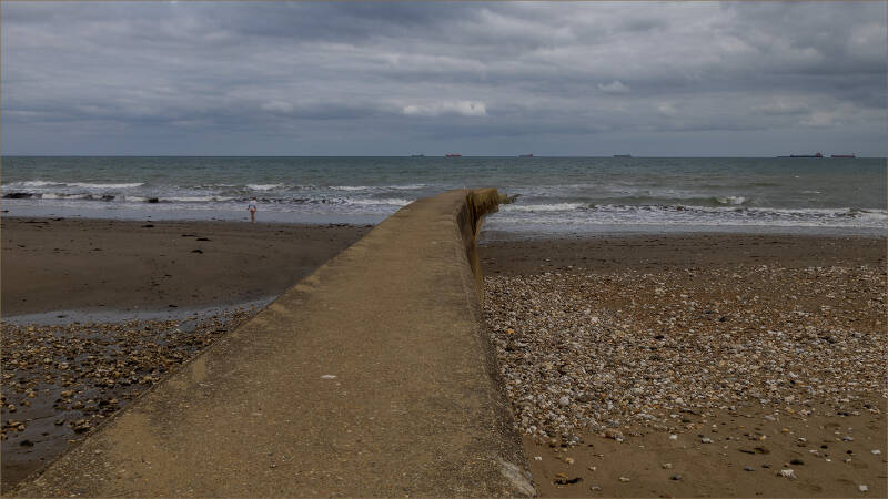 The lone figure, muted tones, and overcast sky all evoke a quiet sense of contemplation and peaceful isolation.